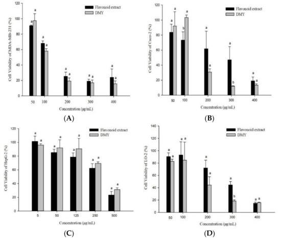 Anti-proliferative activities of the flavonoid extract and DMY against MDA-MB-231 (A), Caco-2 (B), HepG2 (C), and LO-2 (D) cells. (Bars with different letters differ significantly at p < 0.05).