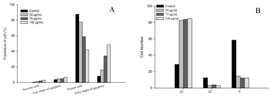 The cell cycle of MDA-MB-231 was detected using a PI staining detection kit. The MDA-MB-231 cells were treated with different concentrations of flavonoid extract for 48 h (0, 50, 75, and 100 μg/mL), and then, the treated cells were collected and stained with a PI staining detection kit(Becton, Dickinson and Company, Franklin Lakes, NJ, USA). The fluorescence intensities of the stained cells were monitored using a FACSCanto cell analyzer. For each sample, 10,000 events were recorded by flow cytometry, and analyzed by CellQuest research software.