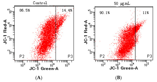 The effect of flavonoid extract on the mitochondrial membrane potential of the MDA-MB-231 cells was investigated by flow cytometry according to a detection kit. The cells were treated with flavonoid extract working solutions at different concentrations (0 and 50 μg/mL), collected, and then stained with a JC-1 detection kit (Becton, Dickinson and Company, Franklin Lakes, NJ, USA). Fluorescence was monitored with a FACSCanto cell analyzer ( Becton, Dickinson and Company, Franklin Lakes, NJ, USA).