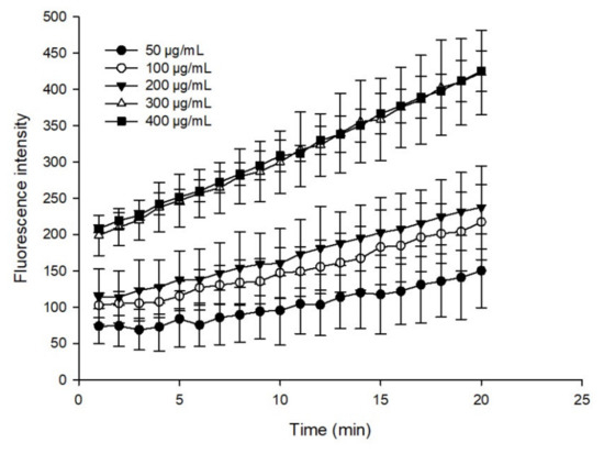 The ROS scavenging activity of the flavonoid extract was assessed using a detection kit. The MDA-MB-231 cells were seeded on a 96-well black plate with a clear bottom polystyrene microplate at a density of 2.5 × 104 cells/(100 μL × well). Incubation was performed for 12 h to allow the cells to attach, and then, the growth medium was suctioned out and the cells were lightly washed with PBS. Then, the cells were treated with the flavonoid extract at different concentrations for 24 h (50, 100, 200, 300, and 400 μg/mL). The treated cells were stained for 30 min according to a ROS staining detection kit. Then, the fluorescence intensity of the stained cells was monitored 20 times every 2 min using a Fluoroskan Ascent fluorescence spectrophotometer (Tecan M200 PRO, Switzerland).