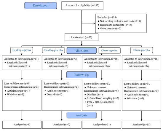 This was a double-blind, placebo-controlled, parallel-group, dose-escalation, exploratory study, where lean, healthy volunteers (BMI 18.5–24.9 kg/m2) and obese patients (BMI ≥ 30 kg/m2) were randomized to either agavins or placebo group for a five-week dose-escalation period. Our study sample size was based on power calculations that used fasting plasma glucose reduction as the reference outcome, avoiding only based calculations on reported GI tolerability evaluations. Using pilot data from our laboratory, where healthy and overweight participants reached a 6.09% reduction in this variable after four weeks of agavins supplementation, and with an estimated 10% reduction in fasting glucose concentration, at 80% power and a significance level of 0.05, 14 participants were required for each intervention group. Three participants were added to compensate for a potential 20% dropout rate [17,18]. Additionally, considering published GI tolerability trials with similar prebiotics, dietary, or functional fibers [19,20,21,22,23] and high interindividual variability in GI tolerance previously reported for agave inulin [16], an additional 8 subjects per group were considered reaching n = 25. Nevertheless, after months of enrollment, very few volunteers for the lean healthy group responded, and even fewer participants met the inclusion criteria. For this and financing difficulties, the research team decided to stop recruiting even if our sample size had not yet been met, aiming to obtain pilot data on GI tolerability to agavins supplementation for the design and considerations in future studies of agavins impact on health.