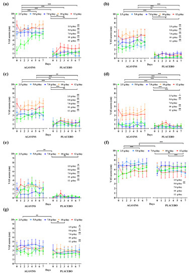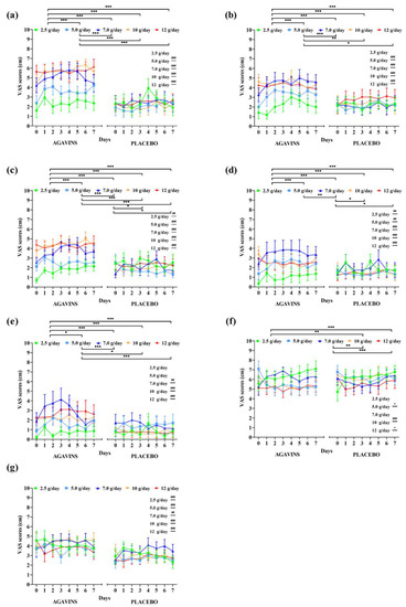 Gastrointestinal symptoms, subjective satiety, and appetite daily ratings evolution in lean individuals after intake of 2.5, 5, 7, 10, and 12 g/day of agavins or placebo during a five-week dose-escalation intervention. (a) Flatulence; (b) Bloating; (c) Borborygmi; (d) Abdominal pain; (e) Diarrhea; (f) Satiety; (g) Appetite. * p < 0.05, ** p < 0.01, *** p < 0.001 within group differences between doses (repeated-measures two-way ANOVA followed by Holm–Šidák’s multiple comparisons test). # p < 0.05, ## p < 0.01, ### p < 0.001 differences between agavins and placebo groups for the same dose (unpaired t-test with Welch’s correction). ANOVA, analysis of variance.