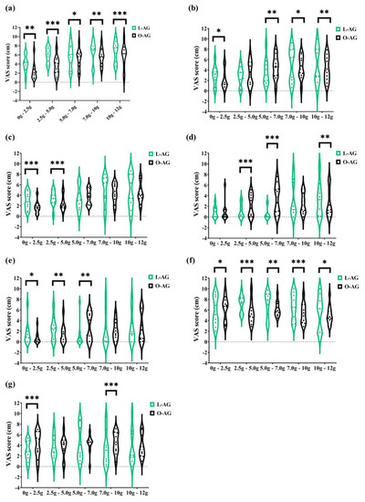 The contrast of gastrointestinal adaptation and subjective satiety and appetite ratings between lean and obese individuals after 2.5, 5, 7, 10, and 12 g/day of agavins during a five-week dose-escalation intervention. Violin plots with individual records are presented. (a) Flatulence; (b) Bloating; (c) Borborygmi; (d) Abdominal pain; (e) Diarrhea; (f) Satiety; (g) Appetite. * p < 0.05, ** p < 0.01, *** p < 0.001 inter-group differences for the same dose (unpaired t-test with Welch’s correction). L-AG, lean group consuming agavins; O-AG, obese group consuming agavins.