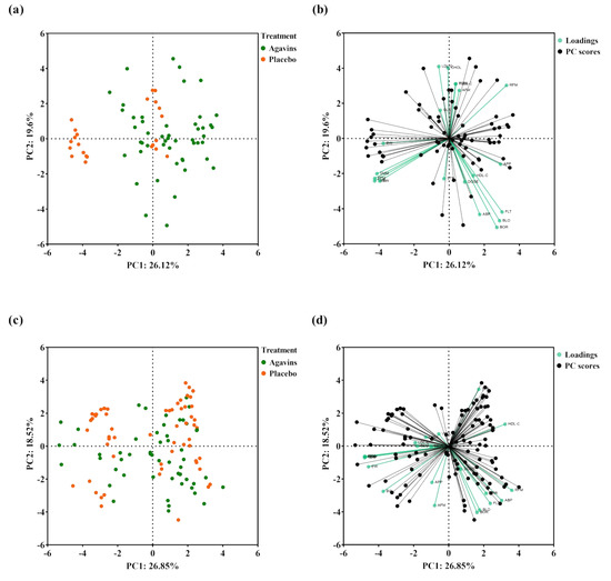 Principal component analysis (PCA) of variables measured in this study. (a) PCA scores plot of lean-agavins and lean-placebo groups; (b) Biplot of the lean-agavins group; (c) PCA scores plot of obese-agavins and obese-placebo groups; (d) Biplot of the obese-agavins group. DOSE, agavins/placebo daily dose; FLT, flatulence; BLO, bloating; BOR, borborygmi; ABP, abdominal pain; DRR, diarrhea; GLU, glucose; CHOL, total cholesterol; TRIG, triglycerides; HDL-C, high-density lipoprotein cholesterol; LDL-C, low-density lipoprotein cholesterol; VLDL-C, very-low-density lipoprotein cholesterol; BW, body weight; RFM, relative fat mass; AFM, absolute fat mass; FFM, fat-free mass; SMM, skeletal muscle mass; TBW, total body water value; EW, extracellular water value; STE, subjective satiety; APP, subjective appetite.