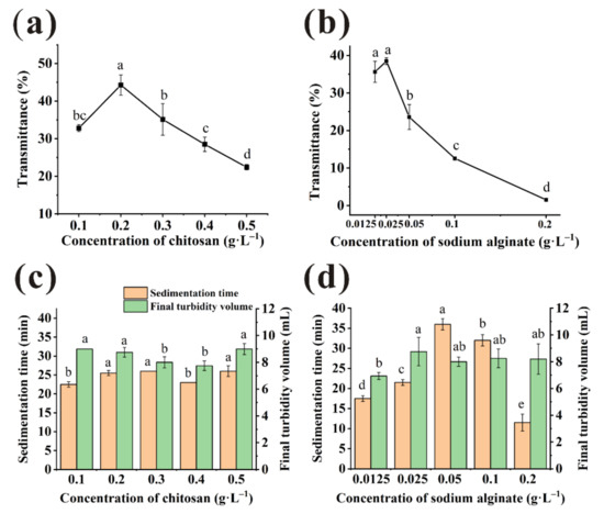 Transmittance of the bayberry juice clarified with chitosan (CTS) (a) and sodium alginate (SA) (b) under various concentration. Sedimentation time and final turbidity volume of the bayberry juice clarified with CTS (c) and SA (d) under various concentration. (Different little letters mean a significant difference at the level of 0.05).