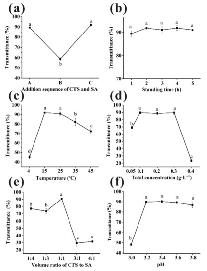 Floc formation is affected by the addition sequence of clarifiers, thus affecting flocculation and clarification [24]. The composite clarifiers with total concentration of 0.2 g/L (CTS:SA = 1:1, v/v) in three sequences were used, and incubated at 25 °C for 3 h. Sequence A led to a significant increase in beverage transmittance compared with sequence B, from 58% to 90% (Figure 2a). No statistical differences (p > 0.05) were observed between sequence A and C, which were 89.42% and 91.91%, respectively.