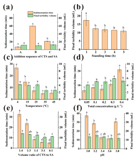 Various factors ((a): addition sequence, (b): standing time, (c): temperature, (d): total concentration, (e): volume ratios, (f): pH) to influence sedimentation time and final turbidity volume. (Different little letters mean a significant difference at the level of 0.05).