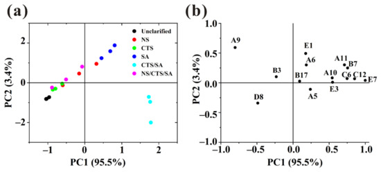 With the aim of studying the similarities and differences between various samples, the concentration of 14 volatile compounds with ROAV > 0.1 was analyzed using PCA. As shown in Figure 4a, 98.9% of the variability in the bayberry juice could be explained by two principal PCs. PC1 explained 95.5% of the variability. which was the main contributor to the separation of samples. At the same time, the loading plot (Figure 4b) enabled us to visualize the relative importance of each volatile compounds and the possible relationships between different samples and volatile compounds [20]. The load factors of PC1 mainly included beta-damascenone, dihydro-5-pentyl-2(3H)-furanone, 3,7-dimethyl-1,6-octadien-3-ol, hexanoic acid, ethyl ester, indicating that these components were significantly impacted on the discrimination. They gave the contribution to the odor of sweet, green, flower and fruit. Along the direction of PC1, unclarified sample and juice clarified by CTS/SA were far apart, which meant there was a great difference between them and the mentioned compounds content of the latter was higher. It indicated that juice clarified by CTS/SA had a certain improving effect on its aroma. The compounds reflected by PC2 mainly include (E)-2-nonenal and 1-penten-3-one. (E)-2-nonenal gave the contribution to the odor of green and cucumber and 1-penten-3-one can emit the pungent and train oil-like odor which would bring unpleasant feelings to consumers. Along the direction of PC2, unclarified sample and juice clarified by SA were far apart, and there was little difference between unclarified sample and juice treated by CTS/SA. Generally, composite clarifiers can improve the aroma by enhancing the sweet, green, flower, and fruit odor.
