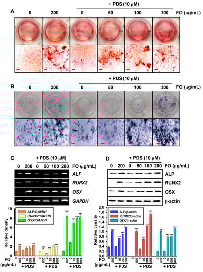 To evaluate calcium deposition, MC3T3-E1 cells (1 × 104 cells/mL) were seeded and treated with 10 μM PDS and FO (0–200 μg/mL) for seven days. Afterward, the cells were washed with PBS, fixed with 4% paraformaldehyde for 10 min at 37 °C. Then the fixed cells were stained with 2% alizarin red for 30 min. Images were obtained using phase-contrast microscopy (Macrotech, Goyang, Gyeonggido, Korea).