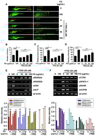 All the zebrafish experiments were conducted as described by the standard guidelines of the Animal Care and Use Committee of Jeju National University (Jeju Special Self-Governing Province, Republic of Korea; approval no.: 2021-0066). To evaluate the therapeutic effect of FO, zebrafish larvae at 5 days post fertilization (dpf) were pretreated with 20 μM PDS for two days, followed by treatment with FO (0–100 μg/mL) for another two days in the presence and absence of PDS. For the preventive effect, FO was pretreated for 2 h, followed by treatment with PDS for four days. The media were replenished with FO and PDS every two days. At 9 dpf, vertebrae were visualized using 0.3% calcein green fluorescent staining. After extensive rinsing, the larvae were anesthetized in 0.04% tricaine methanesulfonate solution and mounted on depression slides using 3% methylcellulose. Fluorescent images were obtained using a CELENA S digital imaging system (Logos Biosystems, Anyang, Gyeonggido, Korea).