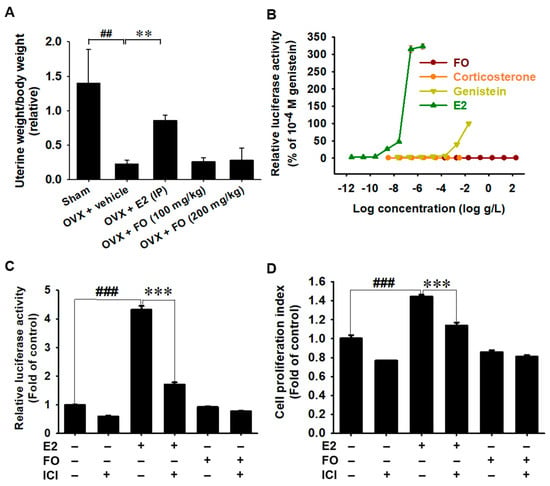 FO is not related to estrogenic activity in ovariectomy (OVX)-induced mice and estrogen response element (ERE)-luciferase transfected MCF-7 cells. (A) OVX-induced mice were orally fed with 100 mg/kg and 200 mg/kg FO and intraperitoneally (IP) injected with 10 μg/kg 17β-estradiol (E2) for 4 weeks. After termination, uterine weight was determined by calculating uterine weight in body weight. (B–D) MCF-7 breast cancer cells (1 × 104 cells/mL) transfected with human estrogen response element (ERE)-luciferase reporter plasmid for 24 h and (B) concentration–response curve of transcriptional activation for FO (2 × 10−4–2 × 102 μg/mL), corticosterone (10−11–10−5 M), genistein (10−10–10−4 M), and E2 (10−14–10−8 M) were measured using luciferase activity. (C,D) In a parallel experiment, FO (200 μg/mL) and E2 (10−9 M) were treated in the presence or absence of 10 μM ICI 182,780 (ICI), and (C) relative luciferase activity and (D) relative cell proliferation were calculated. All data are presented as means ± standard error of the mean (and ### p < 0.001 and ## p < 0.01 vs. untreated MCF-7 cells; *** p < 0.001 and ** p < 0.01 vs E2-treated MCF-7 cells).
