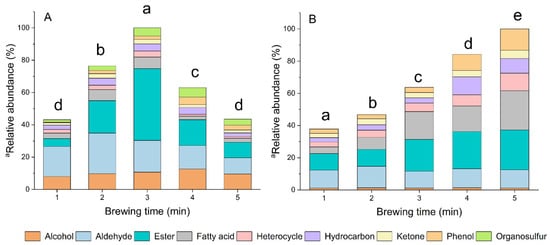 3.3. The Effect of Brewing Time on Volatile Profiles