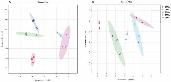 Partial least squares-discriminant analysis (PLS-DA) scores plot for separation of compounds at different brewing times in HS (A) and DI (B), respectively.