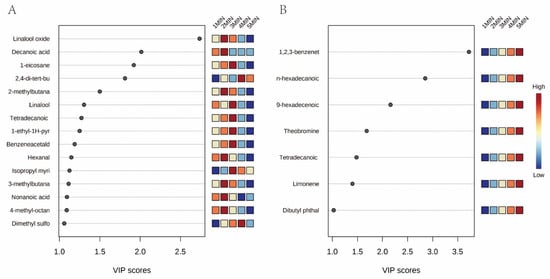 Key individual compounds in headspace (A) and the corresponding tea infusion (B) based on the VIP scores (VIP > 1). Colored boxes on the right indicate the relative concentrations of the compounds under different brewing times.