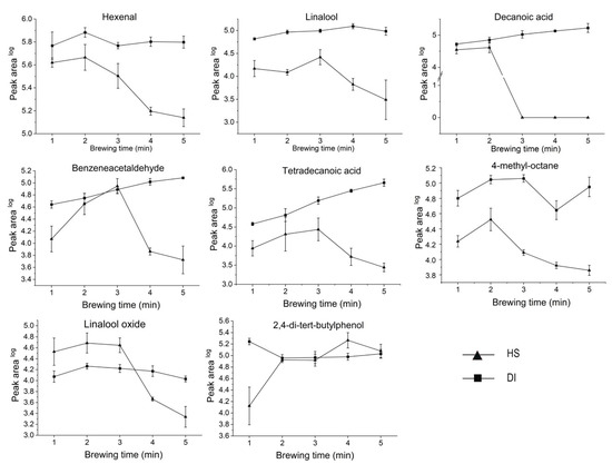 Based on the pathways of the tea aroma formation, two types of reactions could be summarized as the main contributors, enzymatic reactions (occurring in the preharvest tea plant growth and postharvest processing), and the thermophysical and chemical reactions (occurring in the partial postharvest processing, storage, and consumption stages) [56]. Tea brewing can be regarded as the process of substances dissolving, and the flavor formation in the tea infusion, which conforms to the hypothesis of ternary phase diagrams. The phase equilibrium for the tea–water system comprises three components: water, tea leaves (soluble tea solids and insoluble tea solids), and headspace. In other words, the system tends to equilibrate during the tea brewing process, including the VOCs released from the tea leaves into the tea infusion, and the VOCs released from the tea infusion into the headspace through thermophysical and chemical reactions. It has been reported that the transfer of VOCs from the interior of tea leaves across the leaf/water interface was the equilibrium-rate-determining step [57]. Furthermore, the properties and the percentage of the compounds in tea leaves, especially soluble substances, as well as the brewing conditions, played crucial roles in this step. As shown in the Supplementary Figure S3, a high-temperature water in the initial time (1 min to 3 min) could lead to a higher rate of VOC transfer between the tea leaves and the water, and the effect tended to be weaker as the temperature gradually decreased from 92.00 to 62.37 °C. This phenomenon was supported by the variation of the water extract during the continuously increasing time from 1 min to 4 min, and then, levelling it out at 5 min. In other words, it means the motion of the volatiles was reduced by lowering the temperature, strongly affecting their release, maximization, and attenuation. However, for DI, it was observed, qualitatively, that the increase in concentration of its VOCs coincided more with increased brewing time. With regard to the heterogeneous nature of tea leaves, Long VD [58] divided tea solubles into three classes: effectively instantaneous solubles, rapid solubles, and slower solubles. The instantaneous and rapid soluble substances must be immediately accessible to water. The slower dissolving components, due to their higher molecular weight, diffuse more slowly from inside to outside, or through the leaf matrix to the water. The research demonstrated that the concentration of the extracted VOCs in the tea infusion displayed a considerable increase during the initial brewing time (1 to 5 min). The rate-determining step for diffusion was mainly determined by the rapid soluble compounds and slower soluble compounds. As indicated in heatmaps (Supplementary Figure S4), the majority of VOCs in the headspace appeared to first increase, and then, decrease with extended brewing times, whereas the counterparts in the tea infusions roughly exhibited a continuously increasing trend. The possible explanation for this is that compounds continuously dissolve in the tea infusions with extended brewing time, resulting in increasing concentrations. The alteration of concentrations of different compounds in HS were the results of integrative actions of the decreasing temperature and the increased brewing time. As a result, in comparation of the results of HS and DI, 17 of 38 volatiles in HS samples can be detected in DI samples, including eight characteristic VOCs in HS samples (Supplementary Figure S5). The variation of eight common compounds (VIP > 1 in HS, hexenal, linalool, decanoic acid, benzeneacetaldehyde, tetradecanoic acids, 4-methy-octane, linalool oxides, and 2,4-di-tert-butylphenol) in both HS and DI presented a complementary tendency (Figure 4). The decreasing concentration of VOCs in HS caused the increased concentration of volatiles in DI, except for 4-methyoctane and 2,4-di-tert-butylphenol. These two exceptions could occur because the variation of 4-methyoctane and 2,4-di-tert-butylphenol may have been oxidized or degraded to some other undetected macromolecules.
