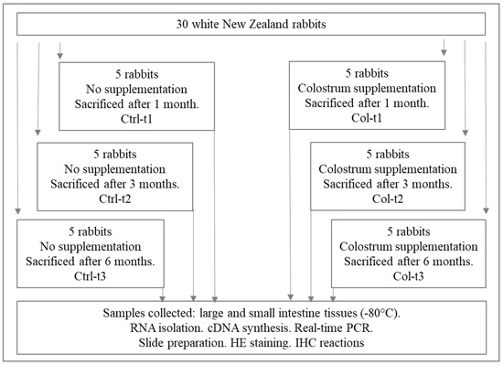 The study was conducted in accordance with Polish law and with the approval of the Local Ethics Committee for Scientific Experiments on Animals in Szczecin, Poland (Resolution No. 27/2015, 12 June 2015). Thirty healthy 6-month-old white New Zealand male rabbits with an average weight of 3.5 ± 0.3 kg were recruited in this randomized, blind experimental study. One month before the surgical intervention, all animals were accommodated in separate cages with free access to food and water. Before the start of the experiment, the animals were randomly divided into six groups (three control groups and three experimental groups), with five animals per group. The control groups consisted of the animals not treated with Colostrum Colostrigen from Genactiv (Poznań, Poland) (n = 15; Ctrl), while the animals from the supplemented groups (n = 15; Lf) received per os an aqueous solution of Colostrum Colostrigen from Genactiv (Poznań, Poland, composition: lyophilized colostrum bovinum) at a dose of 100 mg/kg body weight/day for 1 month (Col-t1), 3 months (Col-t2), and 6 months (Col-t3). Animals were sacrificed after 1 month (Ctrl-t1 and Col-t1), 3 months (Ctrl-t2 and Col-t2), and 6 months (Ctrl-t3 and Col-t3) (Figure 1). The Colostrum dose was chosen based on the published experiences of other researchers, emphasizing that the effects observed were highly dose-dependent. Due to the physiological differences between females and males and the small size of the experimental groups, we decided to conduct analyses in groups composed of males. Thus, we avoided an additional variable in the form of differences of the endocrine system.