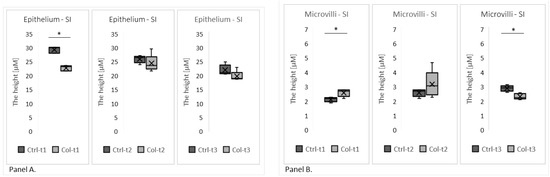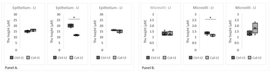 Two group analyses, performed separately at three time points (1 month, 3 months, and 6 months), revealed the Col-induced changes in the morphology of the small intestine epithelium (Figure 2). One month of Col supplementation reduced the height of the epithelium (Col-t1 vs. Ctrl-t1; Figure 2, panel A), but this change was not persistent since it was not found in animals that received Col for 3 or 6 months. Additionally, we observed the elongation of the microvilli in animals receiving Col for 1 month, and, surprisingly, the opposite effect in animals receiving Col supplementation for 6 months (Figure 2, panel B).
