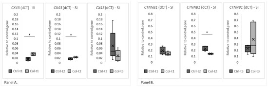 The charts show the deltaCt (dCt), the fold change of gene expression (relative to the housekeeping gene GAPDH) in the small intestine. The (Panel A) shows CX43 and the (Panel B) shows CTNNB1 expression at all three time points of Col supplementation. SI—small intestine. * p (two-tailed) ≤ 0.05.