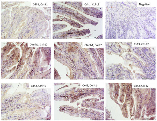Figure 4 shows the most visible changes in protein expression of the epithelial barrier in the small intestine and negative control. In general, the protein expression of cell adhesion molecules corresponded with the quantitative PCR (qPCR) results. There were no apparent differences in Cdh1, Ocln, Hp, Myh9, Vcl, Actg2, and Cdh2 and no differences after 6 months of treatment in all groups. In the small intestine, the most apparent differences were observed in the level of Cx43 protein after 1 and 3 months of supplementation. Similarly, we observed stronger staining for the Ctnnb protein—however, to a lesser degree than in the case of Cx43. Interestingly, the differences in Cdh1 levels were only observed in the Ctrl group, between Ctrl-t1 and Ctrl-t3.