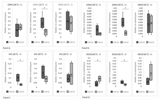 The charts show the dCt, the fold change of gene expression (relative to the housekeeping gene GAPDH) in the large intestine. (Panel A) shows CDH1, (Panel B) shows CDH2, (Panel C) VCL and (Panel D) OCLN. LI—large intestine. * p (two-tailed) ≤ 0.05.