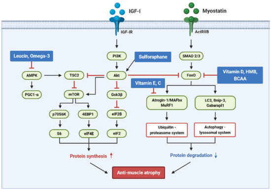 | Branched-chain amino acids (BCAA leucine, valine, and isoleucine) | ![]() ![]() ![]() | Sprague-Dawley rats | ↑ total protein levels and mean cross-sectional area of soleus muscles ↓ atrogin-1/MAFbx ↓ conversion from LC3-I to LC3-II | [40] |