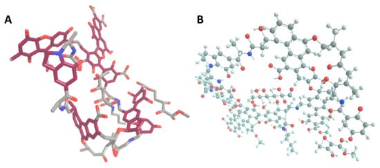 Panel A Energy optimized molecular structure of a small, characteristic part of humic substances (HSs). The optimal 3D structure was calculated by energy minimization of the molecule. This graphic contains typical structural elements and bonds of natural HS that randomly build up their molecular structure, based on NMR and IR studies [7]. Panel B: Atom model of the possible structure of a humic acid monomer. Grey, carbon; white, hydrogen; blue, nitrogen; red, oxygen atoms. Claret colour discerns the carbon atoms belonging to the characteristic polyphenolic aromatic rings (Graphics and energy optimization calculation was created using ChemDraw Ultra and Chem3D software).