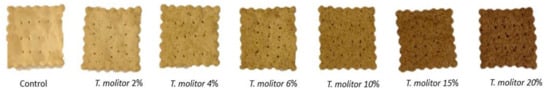 The aim of this study was to evaluate the impact of insect flour incorporation on the appearance, physical properties (texture), biochemical composition, as well as the antioxidant and sensory properties of wheat-based crackers, with the aim of obtaining a final product with the claim “protein source” or “high protein”. Crackers with different contents of Tenebrio molitor flour, ranging from 2% to 20% (%, w/w), were studied to obtain higher than usual contents of bioactive compounds. Indeed, according to several studies, mealworms are a source of protein. A study conducted by Zielińska et al. [] found the following composition of mealworm larvae (per 100 g of dry sample): protein—52 g, fat—24 g, and mineral content—1g. However, the nutritional composition can vary depending on production conditions and life cycle. However, the nutritional composition can vary depending on production conditions and life cycle. Thus, different authors report results with some differences. Wemans [] showed that mealworm larvae had ~45% crude protein, ~18% fat, and ~5% ash (dry matter). Another study conducted by Zhao et al. [] revealed that T. molitor larvae contained about 51% crude protein, 33% fat, and 5% ash on a dry weight basis. González et al. [] showed the nutritional composition of this species using wheat flour as food as ~49% of crude protein, 31% of fat, and ~4% of dry matter.