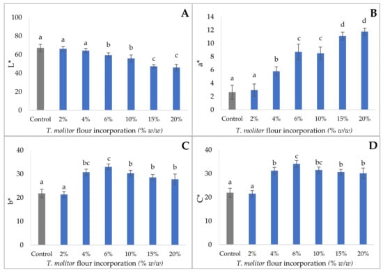 Brightness (L*) (A), greenness (a*) (B), yellowness (b*) (C), and chroma (C*) (D) of crackers containing 2–20% T. molitor (w/w). Results are expressed as mean ± standard deviation (n = 10). Different letters indicate significant differences (p < 0.05) between different concentrations of T. molitor.