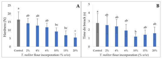 Hardness (N) (A) and time to break (s) (B) of crackers with 2% to 20% T. molitor flour incorporation. Results are expressed as mean ± standard deviation (n = 10). Different letters indicate significant differences (p < 0.05) between different concentrations of T. molitor.