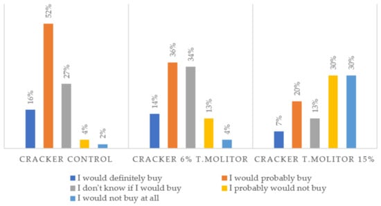 Generally, the control sample was preferred to those containing insect flour. It should be noted that even the panelists did not assign high scores to the standard. Indeed, it obtained the highest score for most sensory attributes except for color, appearance, and aroma. For these three attributes, the cracker with 6% of insect flour incorporation obtained the highest score (3.27, 2.66, and 3.30, respectively, for color, appearance, and aroma, where 3 = pleasant). Moreover, 70% of the panelists assumed that they would be willing to buy the crackers with 6% Tenebrio flour (Figure 5). However, purchase intentions decrease drastically with increasing concentration of insect meal; 60% of the tasters would probably not be available to buy the crackers with 15% incorporation. Similar results were observed in the study by Zielińska et al. [], on the development of muffins enriched with T. molitor flour. The cracker containing a significant amount of insect flour was poorly appreciated by the consumer, especially in terms of taste and texture.