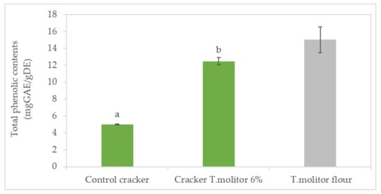 These phenolic compounds make a decisive contribution to the antioxidant capacity; from Figure 6, it is clear that the incorporation of insect flour caused a very significant increase (p > 0.05) in the total phenolic compounds (more than double compared to the control—from 5.02 mg GAE·g−1 to 12.49 mg GAE.g−1). However, since Tenebrio flour has a content of total phenolic compounds of 15 mg GAE·g−1, it can be expected that the value of phenolic compounds may be overestimated in crackers with 6% of Tenebrio flour. This fact may result from the interference of the protein in the quantification of phenolic compounds, by the Folin−Ciocalteu reagent. It should also be noted that the control sample (9.65 g/100 g protein) already has a considerable content of phenolic compounds (5.02 mg GAE·g−1).