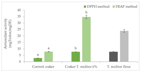 Antioxidant capacity of crackers (expressed as mg Trolox per mg dry extract of fortified crackers) with different levels of insect flour (green) and T. molitor flour. Dark bars for the DPPH method and light bars for the FRAP method. Results are expressed as mean ± standard deviation (n = 3). Different letters correspond to significant differences (p < 0.05) between samples.