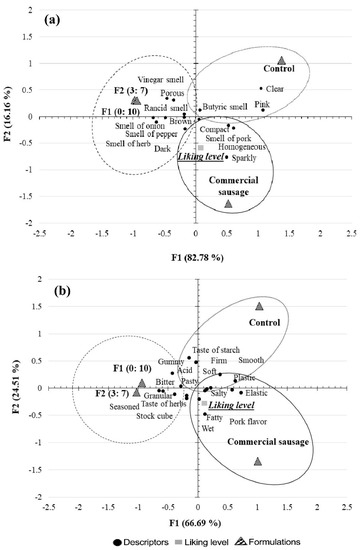 Correspondence factorial analysis of the sausage descriptors. (a) smell-appearance, F1 and F2 axes explain 98.94% of the data; (b) taste-texture. The F1 and F2 axes explain 91.2% of all the data. Control: sausages formulated with 10% starch without GF; F1 sausages formulated with 10% GF without starch; F2 sausages formulated with 3% starch and 7% GF.