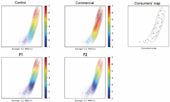 Liking Product Landscape. Consumers’ map created with multidimensional scaling (MDS) fed with overall liking and product acceptance maps created with support vector machines (SVM). Each map presents the average of liking in addition to the mean absolute error (MAE) of the product acceptance maps on a scale of 1 to 7. Control sausages formulated with 10% starch without GF; F1 sausages formulated with 10% GF without starch; F2 sausages formulated with 3% starch and 7% GF.