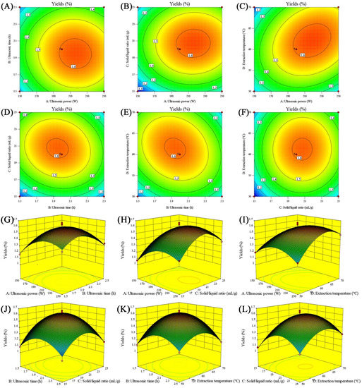 Two-dimensional and three-dimensional maps. (A,G): ultrasonic power and ultrasonic time; (B,H): ultrasonic power and liquid/solid ratio; (C,I): ultrasonic power and extraction temperature; (D,J): ultrasonic time and liquid/solid ratio; (E,K): ultrasonic time and extraction temperature; (F,L): liquid/solid ratio and extraction temperature.