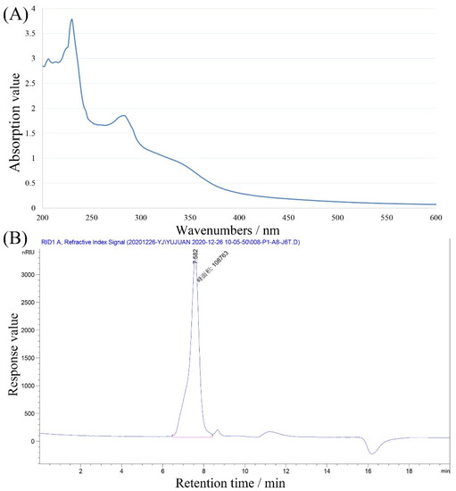 Figure 2A displays an obvious absorption peak at 280 nm, indicating that SMGP contained large quantities of amino acids, which was consistent with the protein content determination result. As presented in Figure 2B, a uniformly distributed peak at 7.582 min was observed, suggesting that the average molecular weight of SMGP was 1.55 × 105 Da based on the standard curve (y = 18.833 − 1.7988x, r² = 0.9991, where y represents the natural logarithm of molecular weight, and x represents the corresponding retention time).