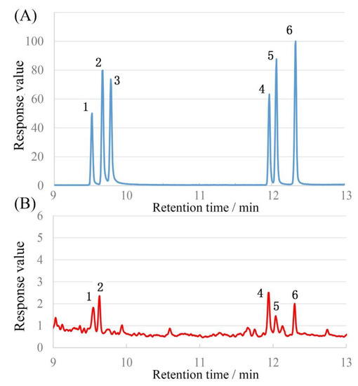Monosaccharide composition results of SMGP. (A), monosaccharide standards; (B), SMGP derivatives. Note: 1—L-rhamnose; 2—D-arabinose; 3—D-xylose; 4—D-mannose; 5—D-glucose; 6—D-galactose.