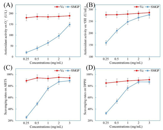 The antioxidant properties of SMGP on ABTS, DPPH, OH−, and O2− free radicals were determined according to the instructions. The SMGP concentrations of 0.25, 0.5, 1, 2, and 3 mg/mL were chosen for scavenging effects evaluation, and the same concentrations of vitamin C (Vc) were used as positive control.