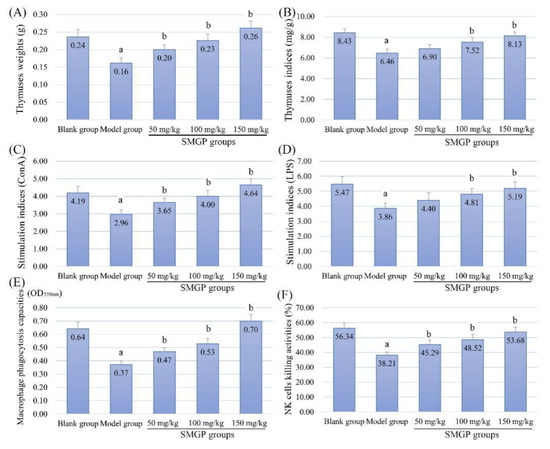 Thymus indicators ((A) weights; (B) indices) and immune cell activities ((C) T lymphocytes proliferation ability; (D) B lymphocytes proliferation ability; (E) macrophages phagocytosis capacity; (F) NK cell killing activities) of mice. Note: a, p < 0.05 compared with blank group; b, p < 0.05 compared with model group.