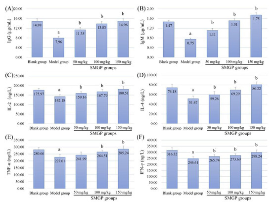 Antibody levels ((A) IgG; (B) IgM) and cytokines expressions ((C) IL-2; (D) IL-4; (E) TNF-α; (F) IFN-γ) of mice in each group. Note: a, p < 0.05 compared with blank group; b, p < 0.05 compared with model group.