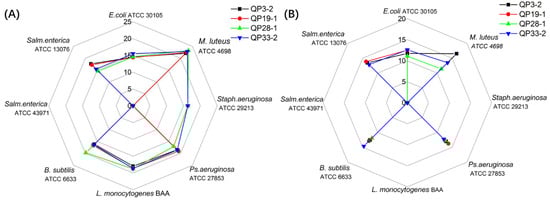 In order to investigate the mechanism of bacterial inhibition of these LAB and whether the acid or the bacteriocin caused the inhibition, some experiments were performed, including assessing the influence of pH, protease, and hydrogen peroxide on the antimicrobial activity. As shown in Figure 1, the antibacterial potential of LAB against all pathogens decreases with elevated pH values, which suggests that the impact of pH on the antimicrobial activity is evident. When the pH of the CFS was 5.0, all four strains showed broad-spectrum inhibition against six of the pathogenic bacteria, with QP28-1 reaching a maximum inhibition circle size of 23.24 mm against M. luteus ATCC 4698. Compared with QP3-2 and 19-1, LAB strains QP28-1 and 33-2 still displayed an inhibition of Staph. aeruginosa ATCC 29213. However, when the pH increased to 5.5, the inhibitory ability of these strains showed a significant decrease; notably, the inhibition of L. monocytogenes BAA completely disappeared, and the original inhibition of Staph. aeruginosa ATCC 29213 by QP28-1 and QP33-2 also disappeared. All four strains still retained a high inhibitory activity against E. coli ATCC 30105, Ps. aeruginosa ATCC 27853, and B. subtilis ATCC 6633, and did not lose performance with the increase in pH, which suggested that these LAB strains of QP3-2, QP28-1, and QP33-2 were good candidates for antimicrobial activity.