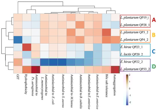 In order to assess the similarity and variability between the LAB strains in various probiotic phenotypes, the probiotic characteristics, including bile salt tolerance, gastrointestinal tract (GIT), hydrophobicity, auto-aggregation, and antimicrobial activity of the isolated LAB strains were analyzed through multivariate analysis based on PCA. As illustrated in Figure 2, the first (PC1) and the second (PC2) principal components represented 81.575% and 11.099% of all the variables (bile salt tolerance, GIT, hydrophobicity, auto-aggregation, and antimicrobial activity), indicating significant differences in the probiotic characteristics of the LAB strains. The eight LAB strains were divided in three areas based on PCA. Five of the LAB strains containing QP3-2, QP4-2, QP19-1, QP28-1, and QP33-2 were clustered close to each other, which showed similar probiotic characteristics and exhibited good tolerance and antimicrobial activity. In contrast, QP20-2, QP23-1, and QP22-2 were listed separately, which displayed weak tolerance and inhibition to pathogenic bacteria in the above study results. Furthermore, a heat map was generated to cluster probiotic strains based on their phenotype (bile salt tolerance, GIT, hydrophobicity, auto-aggregation, and antimicrobial activity). As shown in Figure 3, the probiotic phenotype heat map clustered eight LAB strains into two clusters and four sub clusters, A, B, C, and D. Overall, the probiotic properties of cluster A and B and QP33-2 from cluster D were better than the other clusters. The strain QP4-2 from cluster B was excluded because of its low GIT value, which means that it is difficult to survive and colonize the gastrointestinal tract. The strains QP23-1, QP20-2, and QP22-2 were not selected because they displayed lower values for bile salt tolerance, hydrophobicity, auto-aggregation, and antimicrobial activity. The LAB strains QP19-1, QP28-1, QP3-2, and QP33-2 were selected as potentially probiotic isolates because they exhibited excellent probiotic phenotypes, especially in antimicrobial activity.