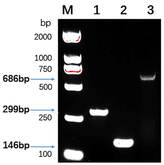 Agarose gel electrophoresis of the PCR products of QP28-1 bacteriocin-related genes. Lane M: DNA marker; lane 1: the product of plnS (299 bp); lane 2: the product of plnN (146 bp); and lane 3: the product of plnW (686 bp).