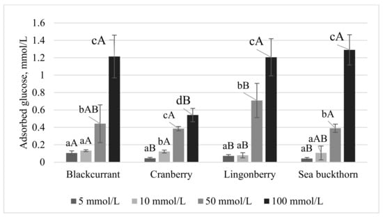 Glucose adsorption capacity at different concentrations of glucose (5, 10, 50, and 100 mmol/L) of berry PP. Values expressed as average ± st. dev. Different letters among columns indicate significant (p < 0.05) differences (lower case—among concentrations; capital letters—among berry PP with the same glucose concentration).