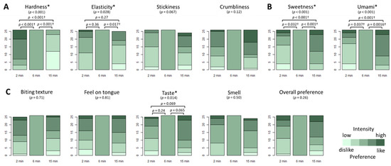 Figure 1. Sensory characteristics of edamame beans boiled for 2, 6, and 15 min. Objective evaluations for physical characteristics (A) and taste components (B) and subjective evaluation for individual preferences (C) by 26 panelists are shown by cumulative bar plots. Asterisks (*) indicate the evaluation components where significant differences among processing conditions were observed (Friedman test, p < 0.05); for these components, pairwise comparisons between any two of the three combinations were performed, and the combinations with significant differences are marked by daggers (†) (Wilcoxon signed-rank test with Holm correction at α = 0.05).