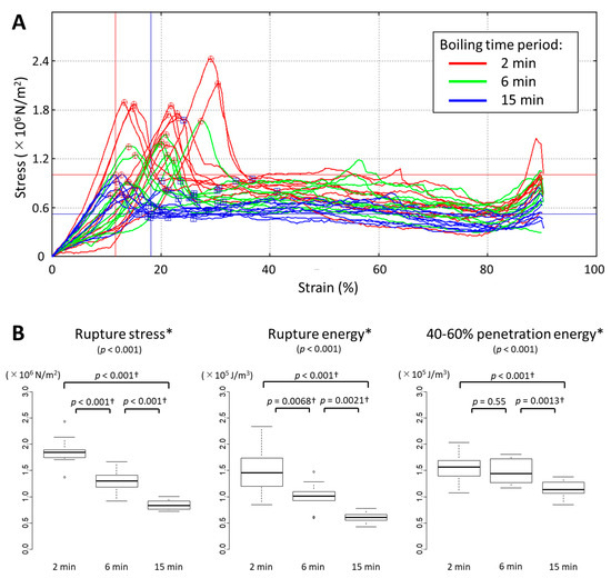 Figure 2. Plunger penetration tests of edamame beans boiled for 2, 6, and 15 min. Strain–stress profiles of the penetration of edamame beans by a cylindrical plunger (1-mm diameter) are shown in (A). Rupture stress, rupture energy, and 40–60% penetration energy are shown by box plots (B). Non-parametric statistical analyses were applied because of the heteroscedasticity of the data. Asterisks (*) indicate the measurements that showed significant differences among processing conditions (Kruskal–Wallis test, p < 0.05). Daggers (†) indicate the combinations that showed significant difference between two processing conditions (Wilcoxon rank-sum test with Holm correction at α = 0.05). White circles (°) indicate outliers.
