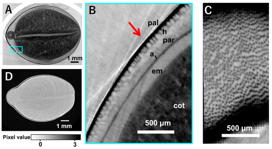 Figure 3. Images of X-ray phase-contrast CT (AC). An X-ray absorption image (D) was taken for comparison with X-ray phase-contrast, and other images, whose pixel value represents phase shift, were prepared by X-ray phase-contrast. A tomogram of an edamame bean (A,D), high-resolution image (3.47 μm/pixel) of the epidermis of the edamame bean for the area indicated by the cyan square in A (B), and the cross-sectional image of the hourglass cell layer perpendicular to the red arrow in B (C). The black dots are assumed to be hourglass cells (C). Abbreviations in (B): pal, palisade layer; h, hourglass cell; par, parenchyma; a, aleurone cells; em, endosperm; cot, cotyledon.