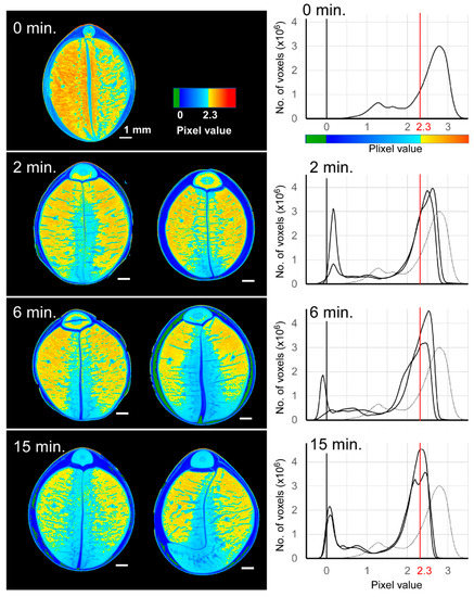 Figure 5. Tomogram images of edamame beans with different boiling times. (Left); Two samples are shown for boiling times of 2, 6, and 15 min. (Right); Frequency distribution of the pixel value of each voxel. In each histogram, the distribution of non-boiled samples is shown by the broken line.