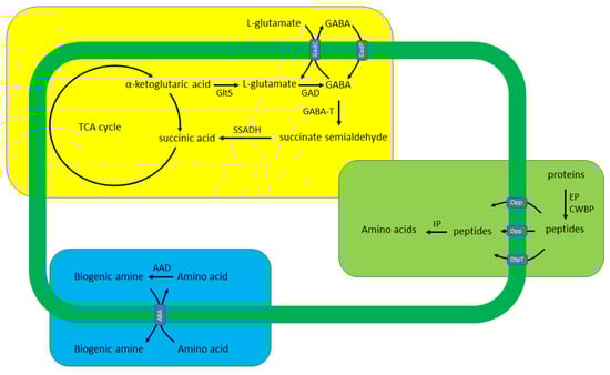 Production of GABA (yellow box), bioactive peptides (green box), and biogenic amines (blue box) by LAB. AAD: amino acid decarboxylase; ABA: amino acid/biogenic amine antiporter; CWBP: cell-wall-bound proteinases; Dpp: peptide (2–9 amino acids) ABC transporter; DtpT: ion linked peptide (2–3 amino acids) transporter; EP: extracellular proteinases; GABA-T: GABA aminotransferase; GAD: glutamate decarboxylase; GltS: glutamate synthase; IP: intracellular peptidases; Opp: oligopeptide (4–18 amino acids) permease; SSADH: succinate semialdehyde dehydrogenase.
