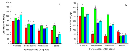 Polysaccharide compounds from the different Aloe vera gel samples: ILF (red), DAG60 (green), DAG80 (blue), DAG100 (cyan) (A). AILF (red), AAG60 (green), AAG80 (blue), AAG100 (cyan) (B). Error bars indicate SD. Significant differences for different samples for each compound are indicated by different letters. (The exact values can be found in Table S1 of the Supplementary Materials).